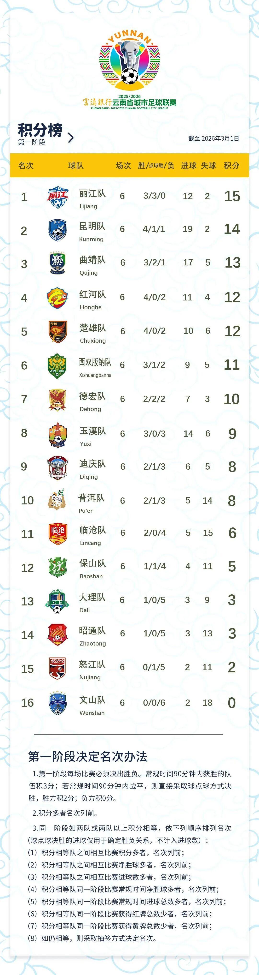 在 2025/2026 富滇银行云南省城市足球联赛第一阶段的较量中,丽江队以 6 战 3 胜 3 平(点球决胜)的不败战绩,积 15 分高居积分榜首位,成为联赛至今唯一保持不败的球队。